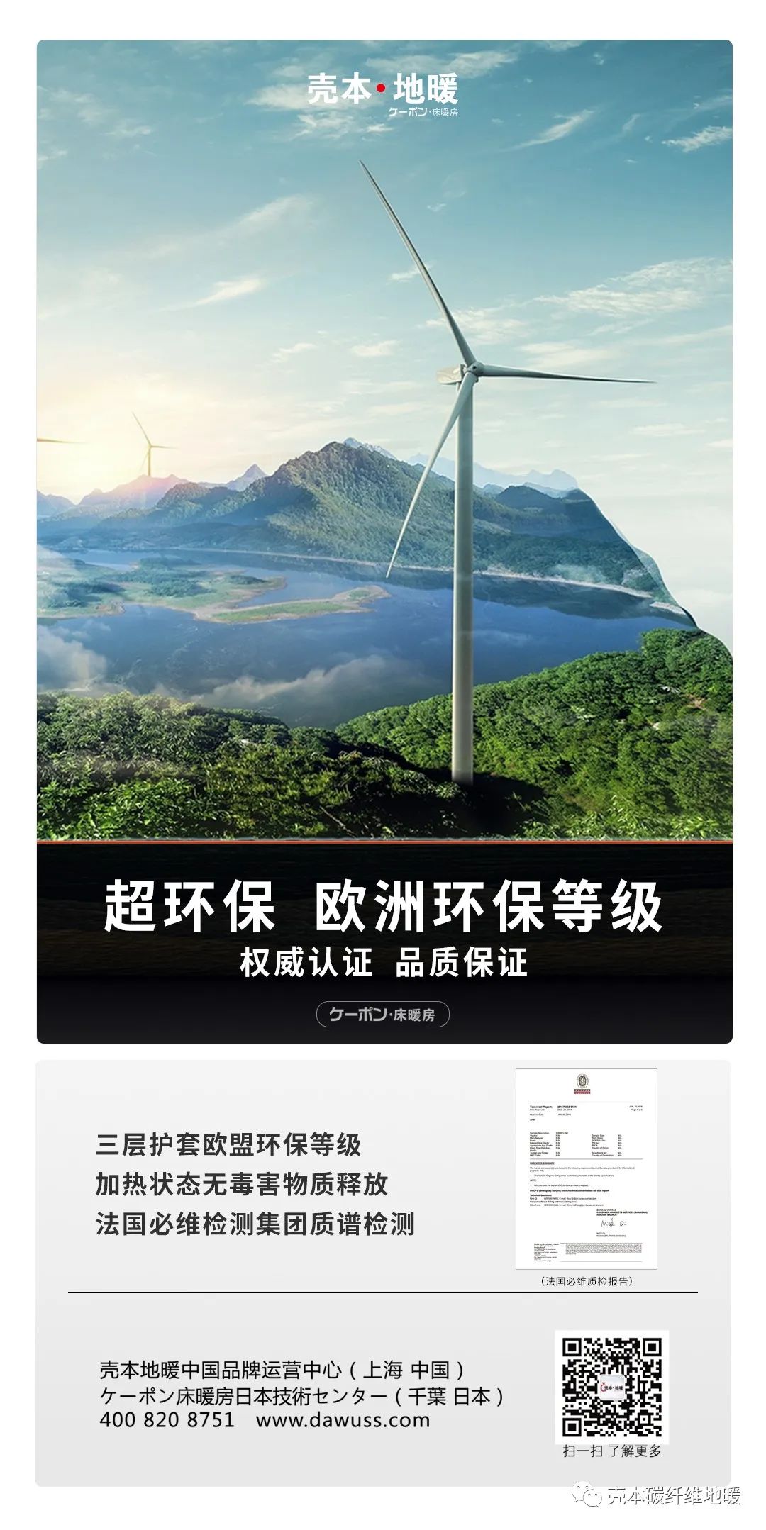 環保裝修保護家人健康。殼本地暖全部才用歐盟環保等級材料。在加熱及燃燒狀態下無有毒物質釋放,為環境健康護航。國際專業環保監測機構權威鑒定。讓每一份溫暖更環保更健康。...